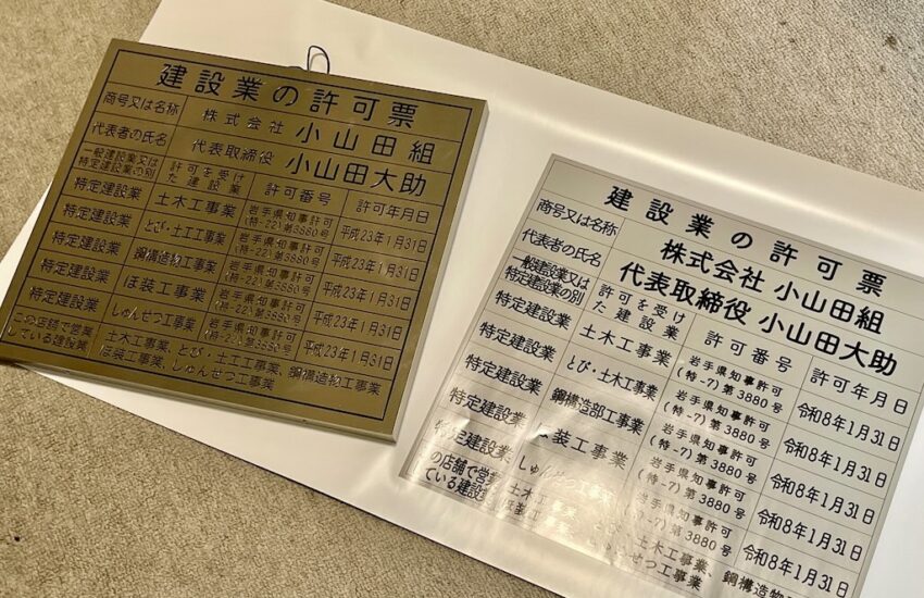 小山田です。建設業の許可を更新したのに、掲示物の日付とか番号を直していませんでした。前は、金属のものにターポリンで作ったものを被せていましたが、今回はステッカーを作成して張り付けてみました。 元は、金属だったので、同