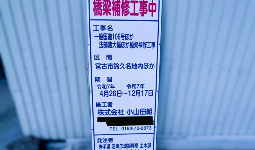 はしばです。。。今回は、【一般国道106号ほか法師渡大橋ほか橋梁補修工事】の工事名について説明したいと思います。 工事名の中に『一般国道106号ホカ』『法師渡大橋ホカ』と、ホカホカしております。なにがホカホカかという … 続きを読む 傷んだ橋を補修しました_工事名