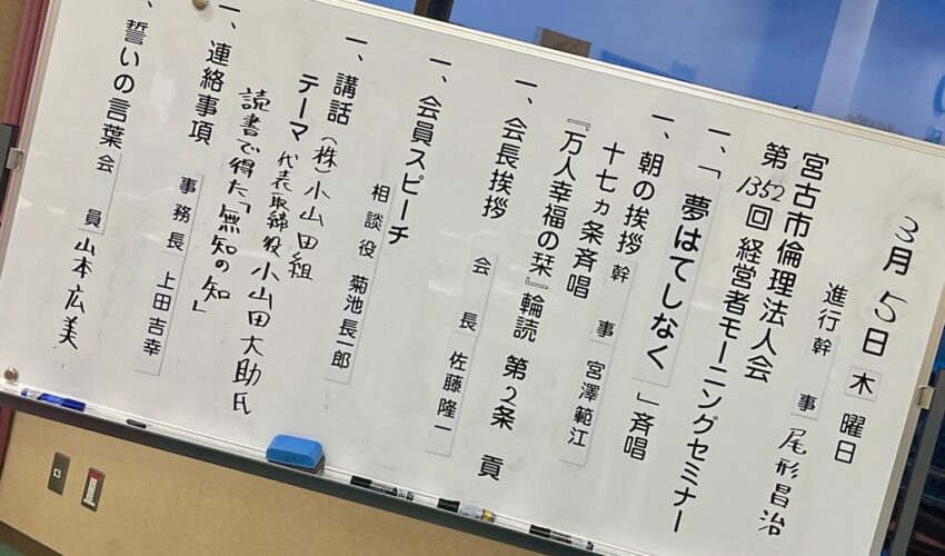 先週末(2/26)のとある宴席で、わたしは覚えがありません(笑)が、セミナーの講師を頼まれたらしく、今週の頭(3/2)に、宮古市倫理法人会の事務局から会社に連絡が入りました。 「宮古市倫理法人会モーニングセミナーの講 … 続きを読む モーニングセミナー講師