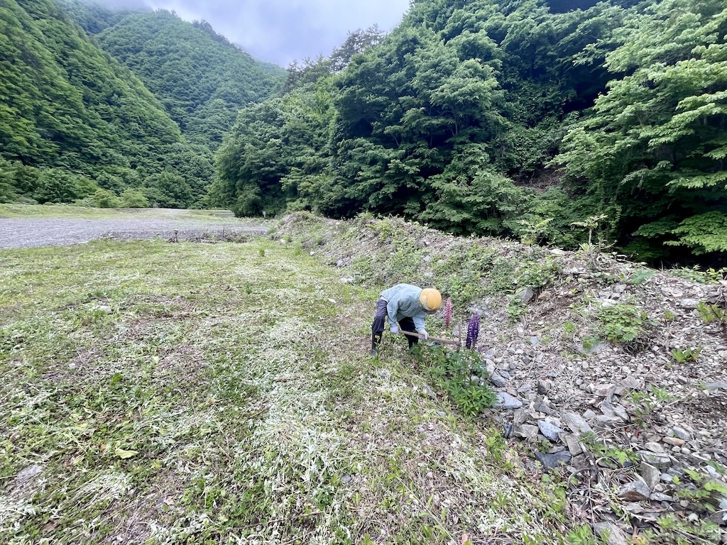 会社の土地を草刈りしています。花が残してあったので、家にでも持っていくのかと聞いたら、すでに持っていったという。