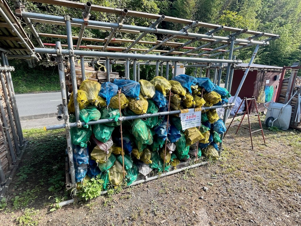 無人販売所のところには廃材をPPバンドで結束したものと、土のう袋に入れた端切れや皮、チェンソーのカスを入れたものが大体、50〜60束(袋)あります。ここのものは。1束(袋)200円で提供しています。