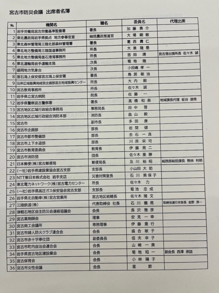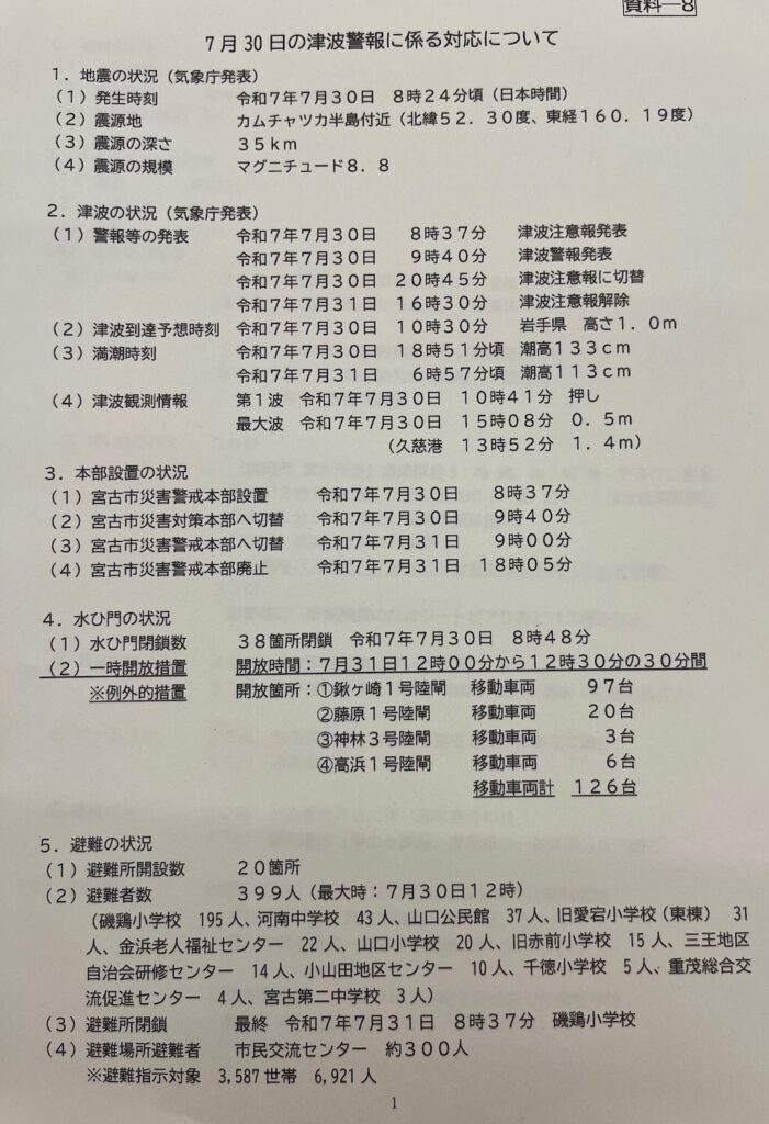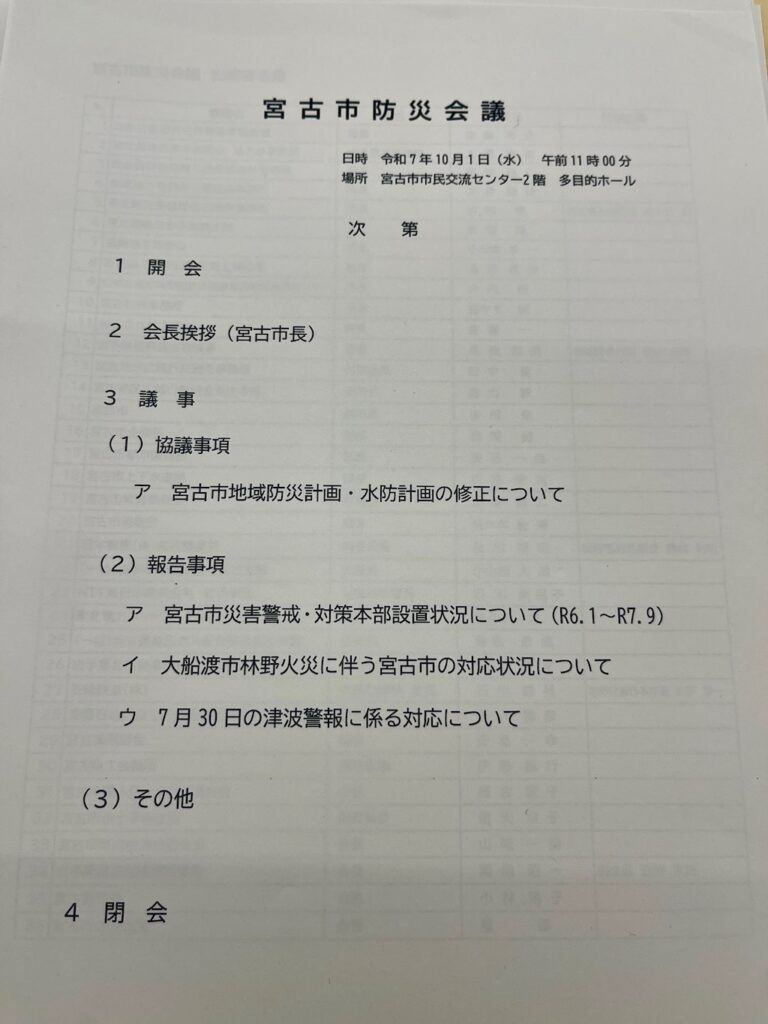 令和7年_宮古市防災会議に参加してきました。当初、今年の開催は8月1日の予定でしたが、7月30日にカムチャッカ半島付近の地震で津波警報が出されたため、会議自体が延期になって9月の開催になったようです。