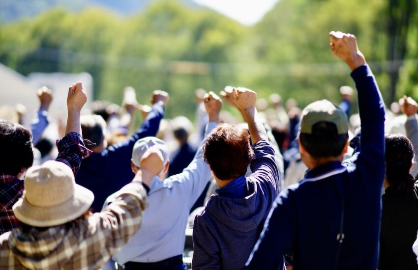 事業説明 と 工事現場内見学 から始まり、主催者あいさつ、来賓祝辞、大会決議 から、最後は エイエイオー三唱 で、住民の声を届ける形で終了です。
