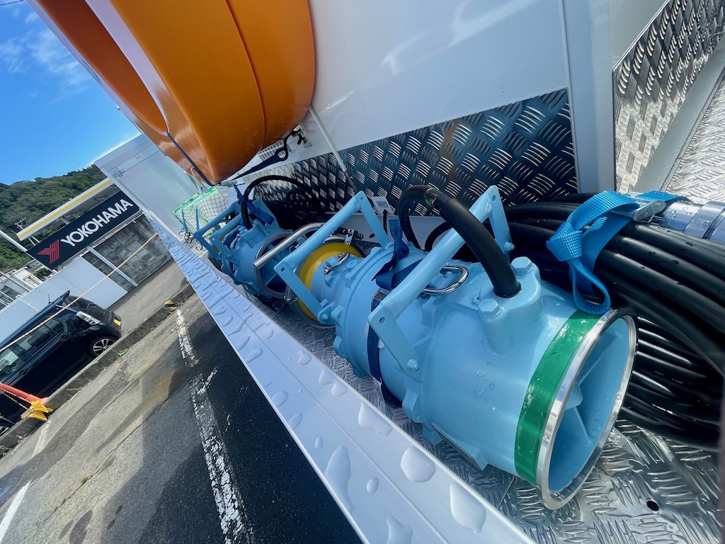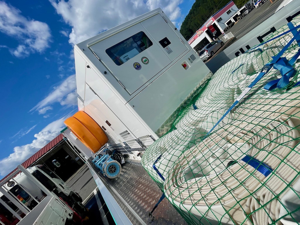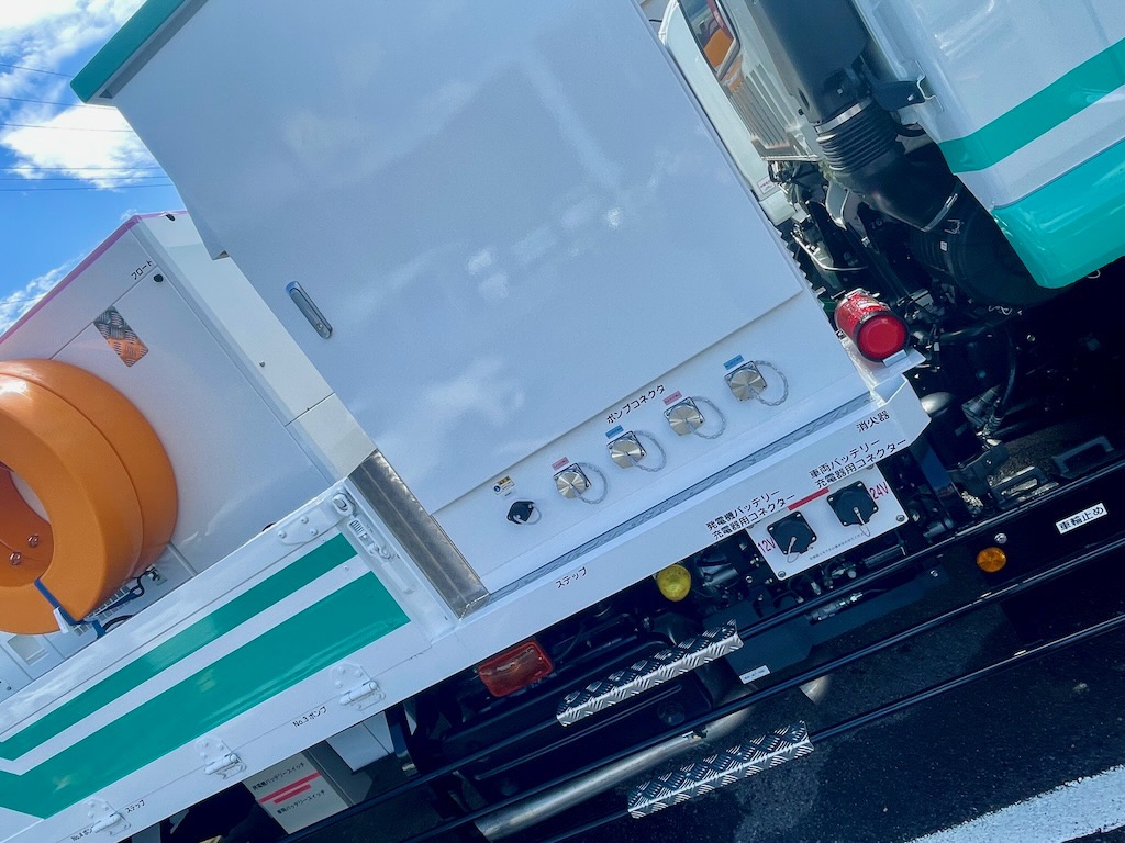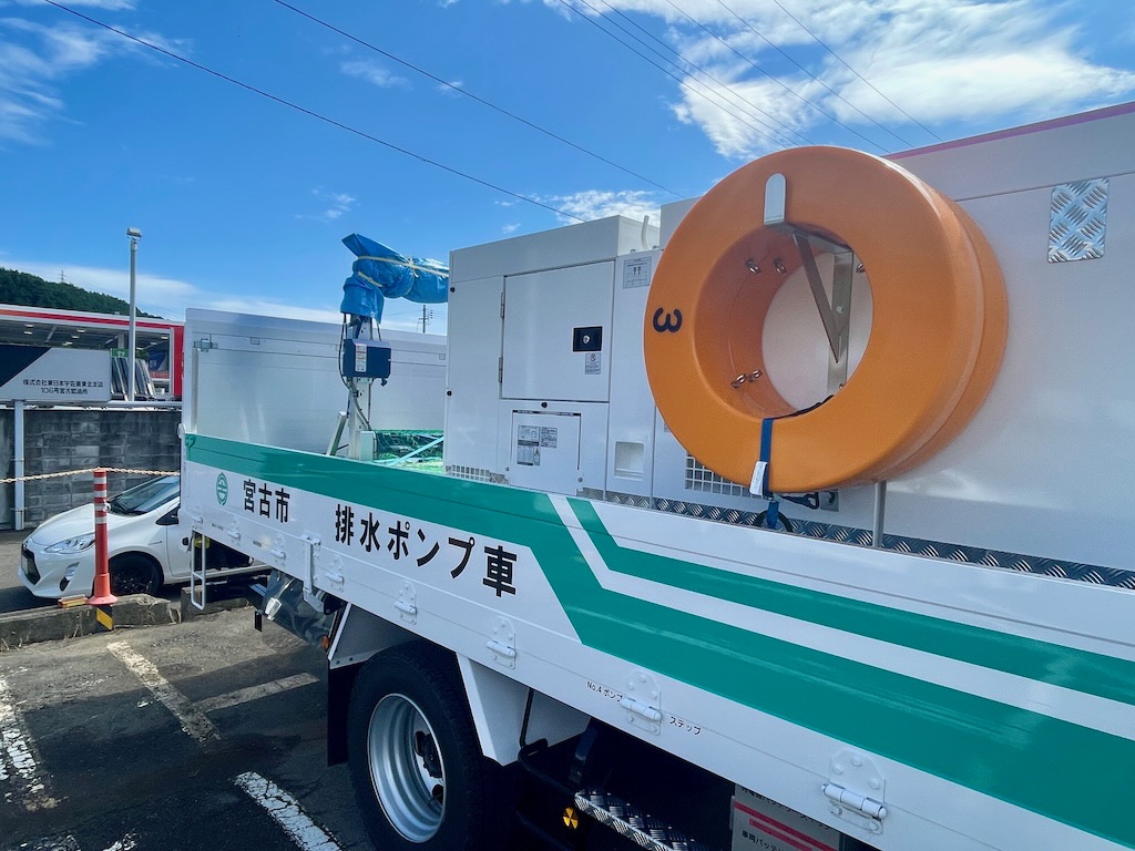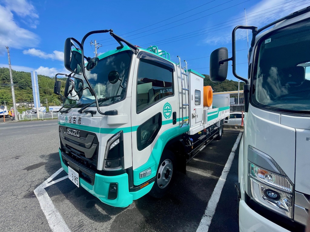 いすゞさんに用事があって寄り道したら、宮古市のポンプ車が来ていたので、写真を撮らせてもらいました。昨年の8月に、岩手河川国道事務所さんから田鎖地区に、排水ポンプ車の派遣を受けた経緯がありました。宮古市でも導入しようということになり、この度、納車まで至る運びになるようです。