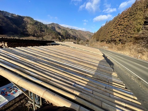 薪置場の屋根は、竹で作ってもらったのですが、どうしても隙間から水が滲み出ていたので、ターポリンを竹の屋根 に、タッカーで張り付けてもらいました。耐久性はどんなもんでしょう。(笑)