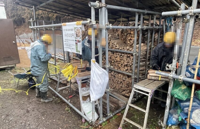 結束済みの300円のものが、少なくなってきたので、すでに結束済みのものを販売所側に移動し、新たに結束してもらい、それを後ろに補充してもらいました。 前は薪を作ってから、すぐに結束して結束機でバリッと締めてもらっていま