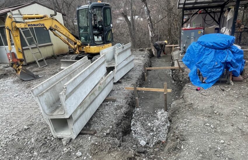 はしばです。。。 土木工事にはかかせない生コンクリート打設。型枠に剥離剤を塗って、バイブレーター、スコップ、コテ、準備OK! でもミキサー車も到着したのに現場監督と生コン屋さんが『なんか』やってて生コン打設が始まらない